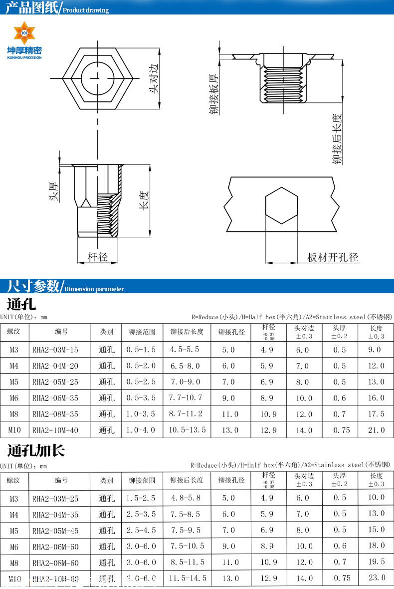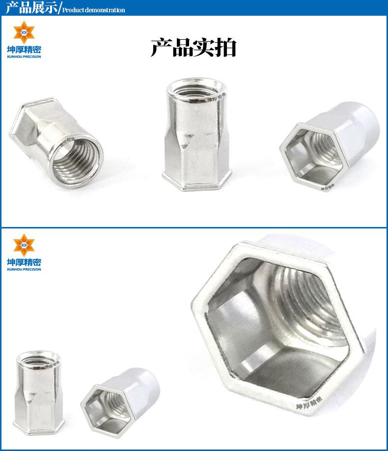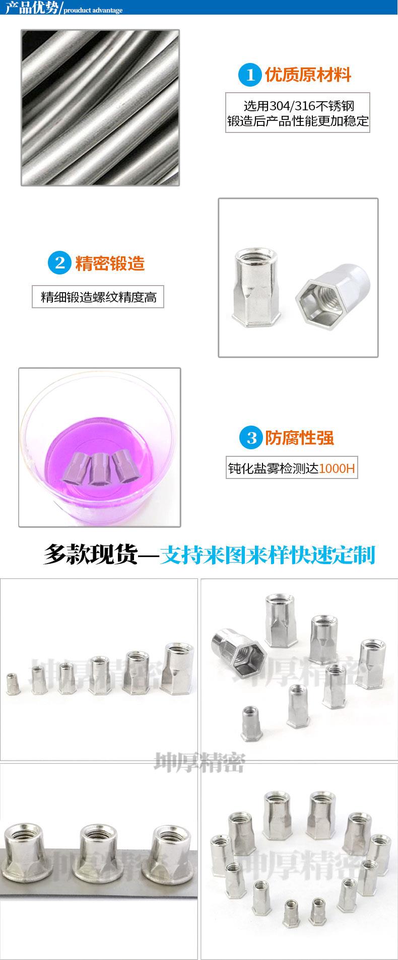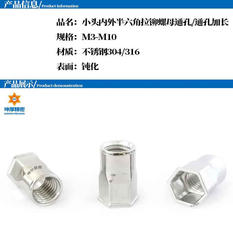 产品详情:M3-M10小沉头内,外半六角拉帽铆钉螺母通孔不锈钢拉铆螺母直销